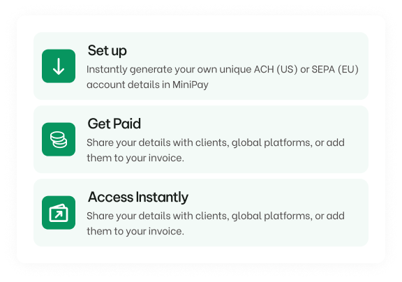Get your own U.S. (ACH) and European (SEPA) account numbers linked directly to your MiniPay wallet.
